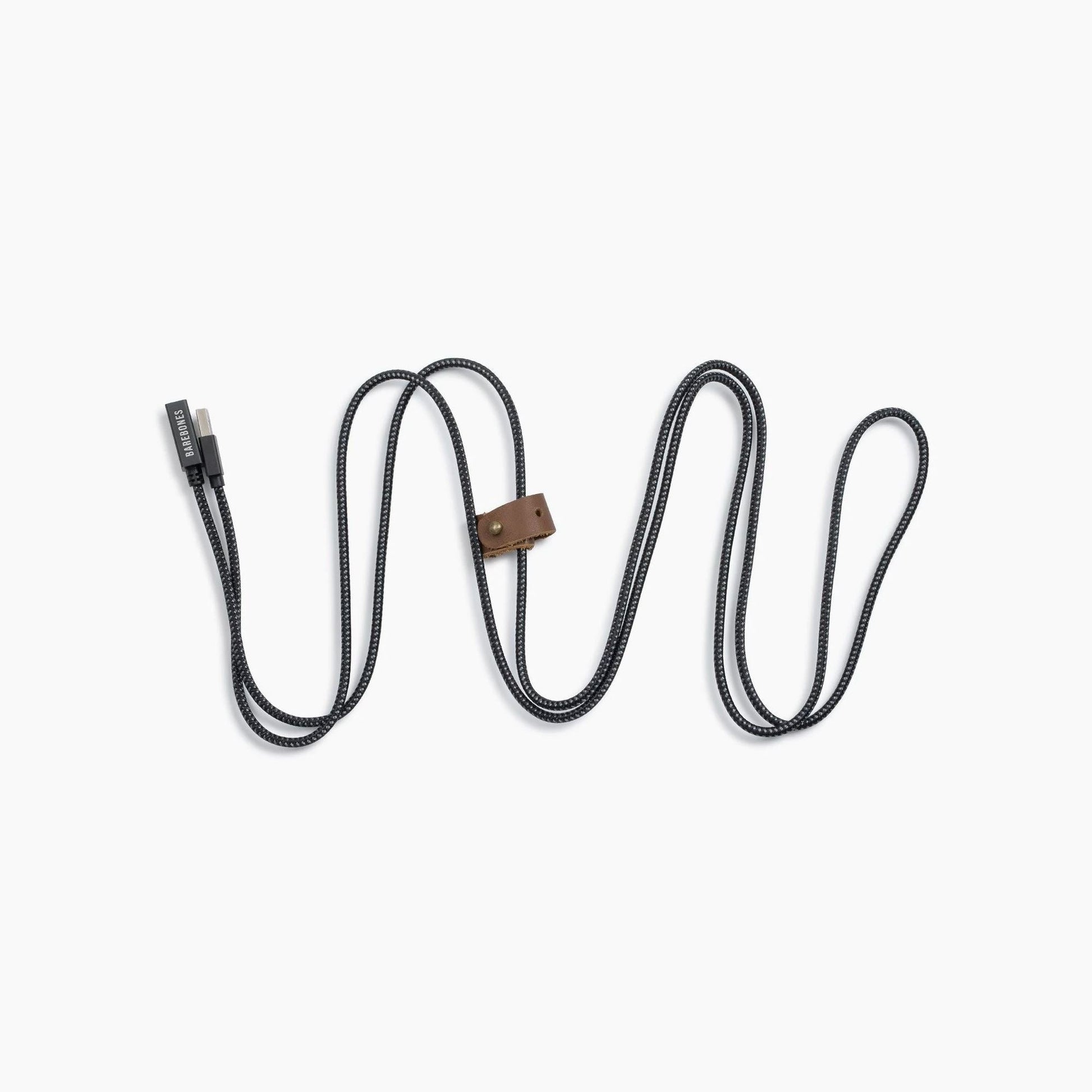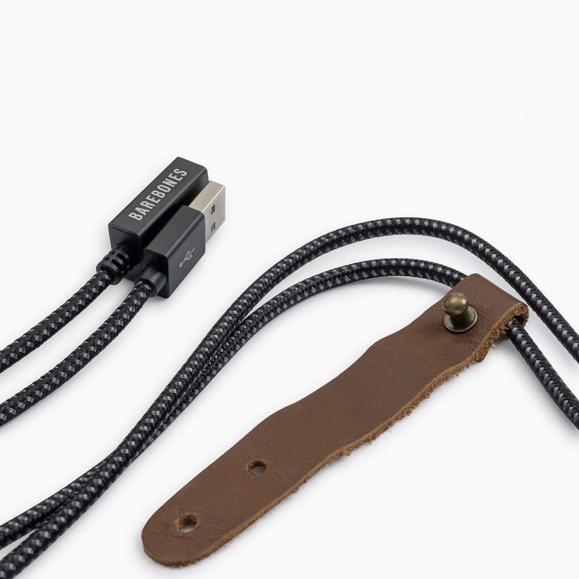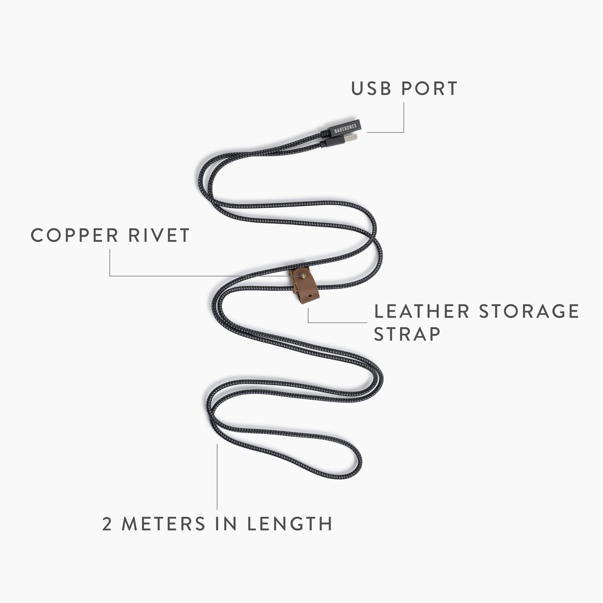 Two meter extension cord features universal USB charging port for use with Barebones rechargeable lights. Durable leather holding strap features copper rivet for neat and compact storage. Modern black design seamlessly blends into the background so you can enjoy your experience undistracted.