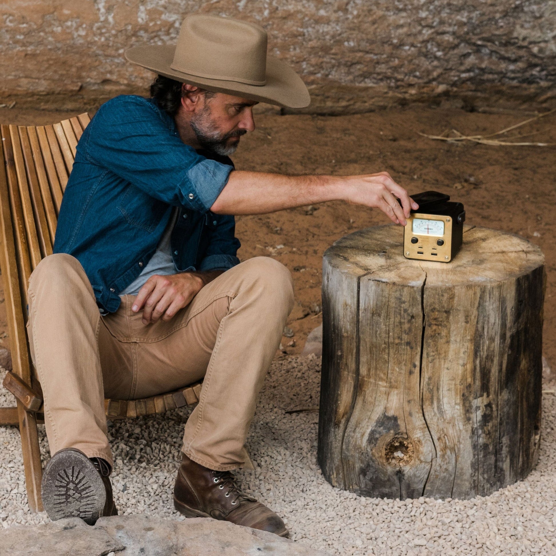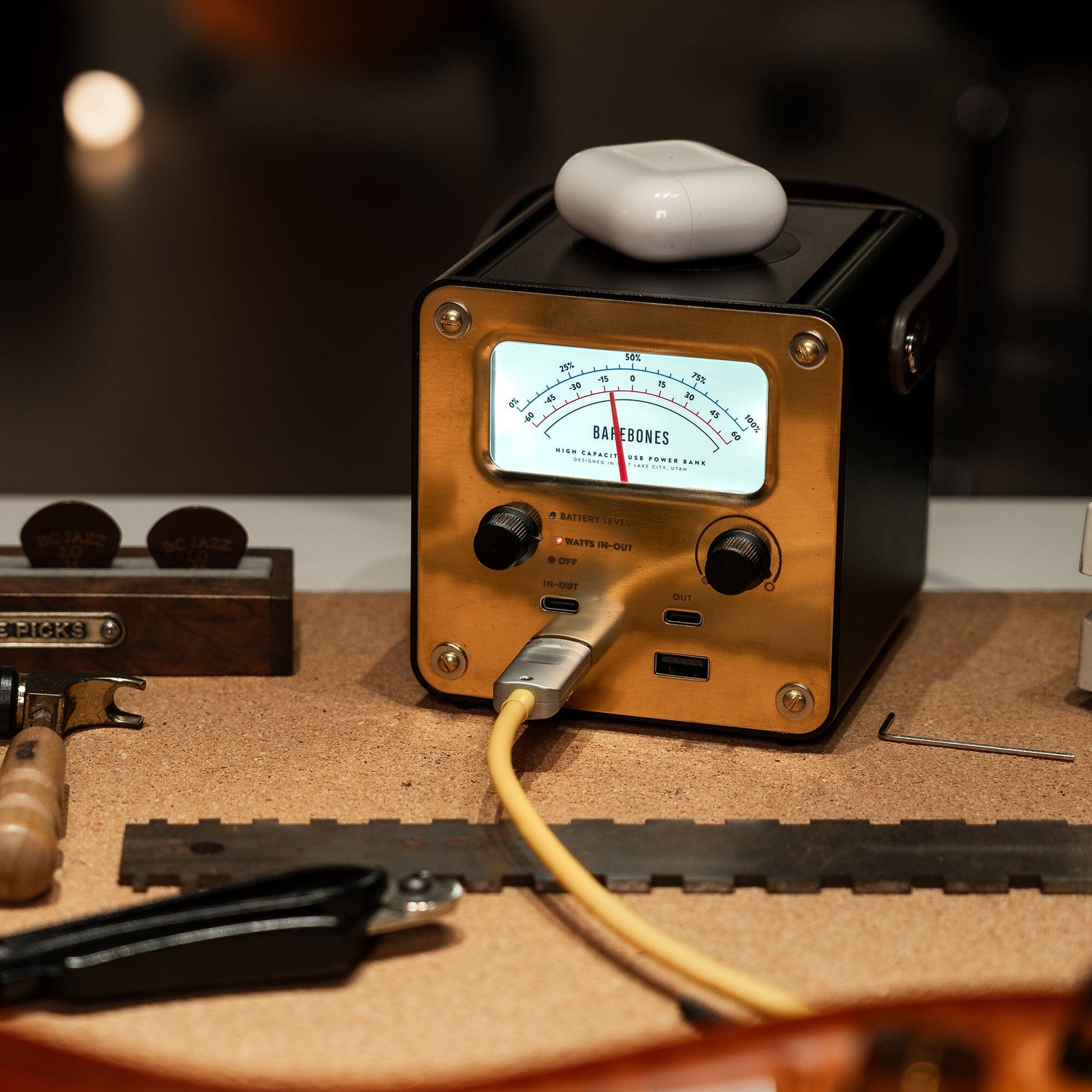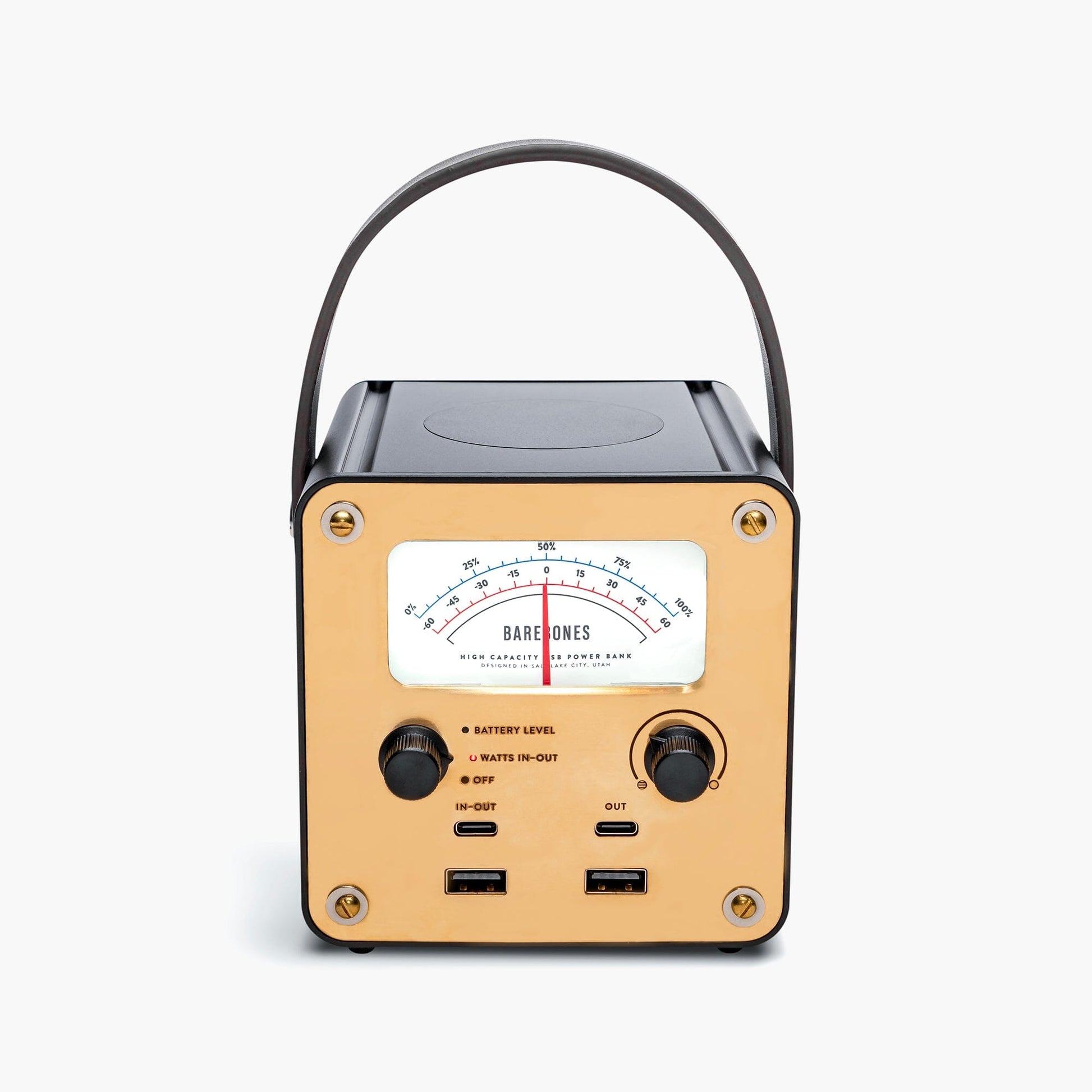 A unique, vintage-inspired power bank, meticulously crafted for seamless travel, van camping, and beyond. This charger boasts an aluminum body, complemented by elegant brass front and back faceplates, accented with leather and copper detailing for an exquisite aesthetic and tactile experience. Designed with versatility in mind, this power bank features USB-C, USB-A, and wireless charging, allowing you to charge up to five devices simultaneously, including your smartphone and computer*. The Power Station delivers a continuous output of approximately 60 Watts and is equipped with a robust 100-120 Watt-hour capacity.