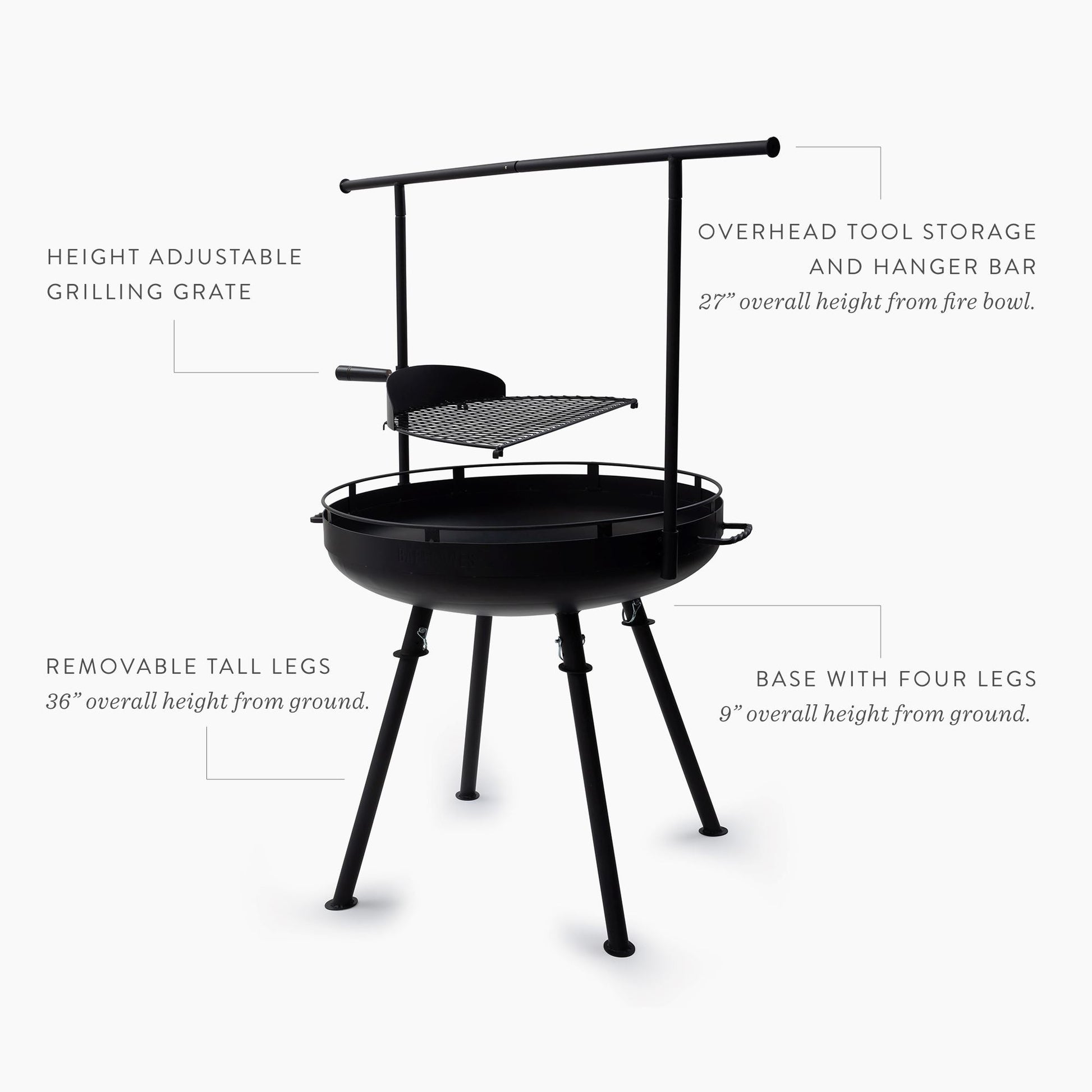 Meet your outdoor cooking match. When you’re ready to update your grilling system, the Barebones solid steel Cowboy Fire Grill System is the absolute go-to. Designed with direct input from Barebones open fire chef partners, this modular design allows for multi-use as fire pit, open fire grilling, and cooking station. Adjustable grill grate gives you choice for the source and distance of heat, creating perfect cooking conditions every time. Overhead tool storage and hanger bar is an organizer's dream with additional side table and grill grate available for purchase. Fire it up, cook, and feast just about anywhere, and when you’re done, break it down for storage. There’s no limit to what this grill system can do.