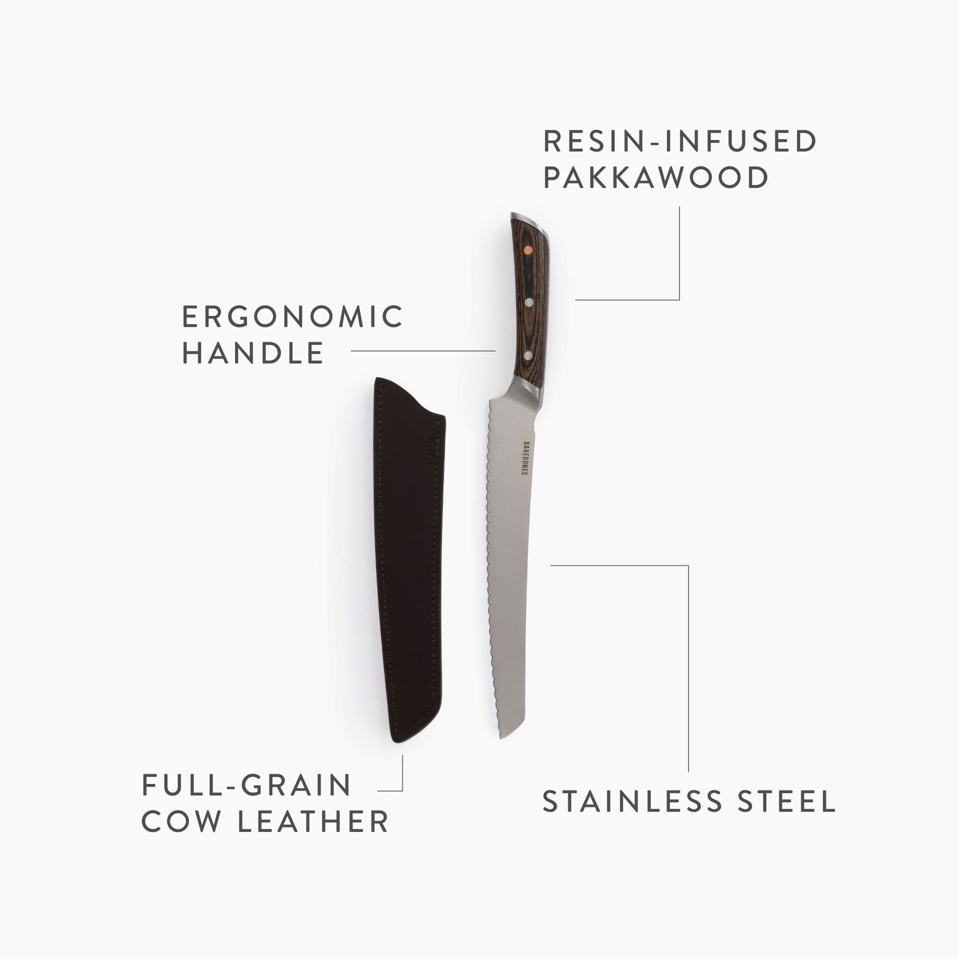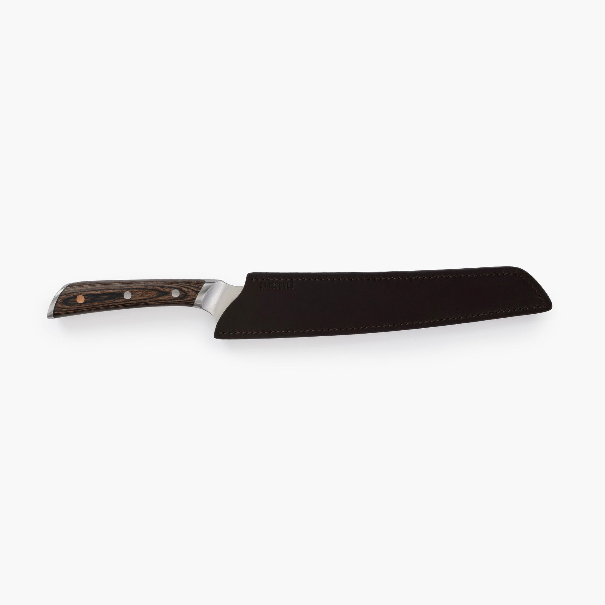 The full-tang, forged stainless steel blade is German-grade, strong, and durable. Blade notches for thumb and finger allow for a professional grip, control, and accuracy when slicing, dicing, and mincing. Pakkawood handle is weighted and balanced; This stabilized composite wood is ideal for culinary purposes as its heat and moisture-resistant. Included sleeve weathers real-world use while protecting the blade from dulling. Leather material will only soften over time to a beautiful, smooth patina.