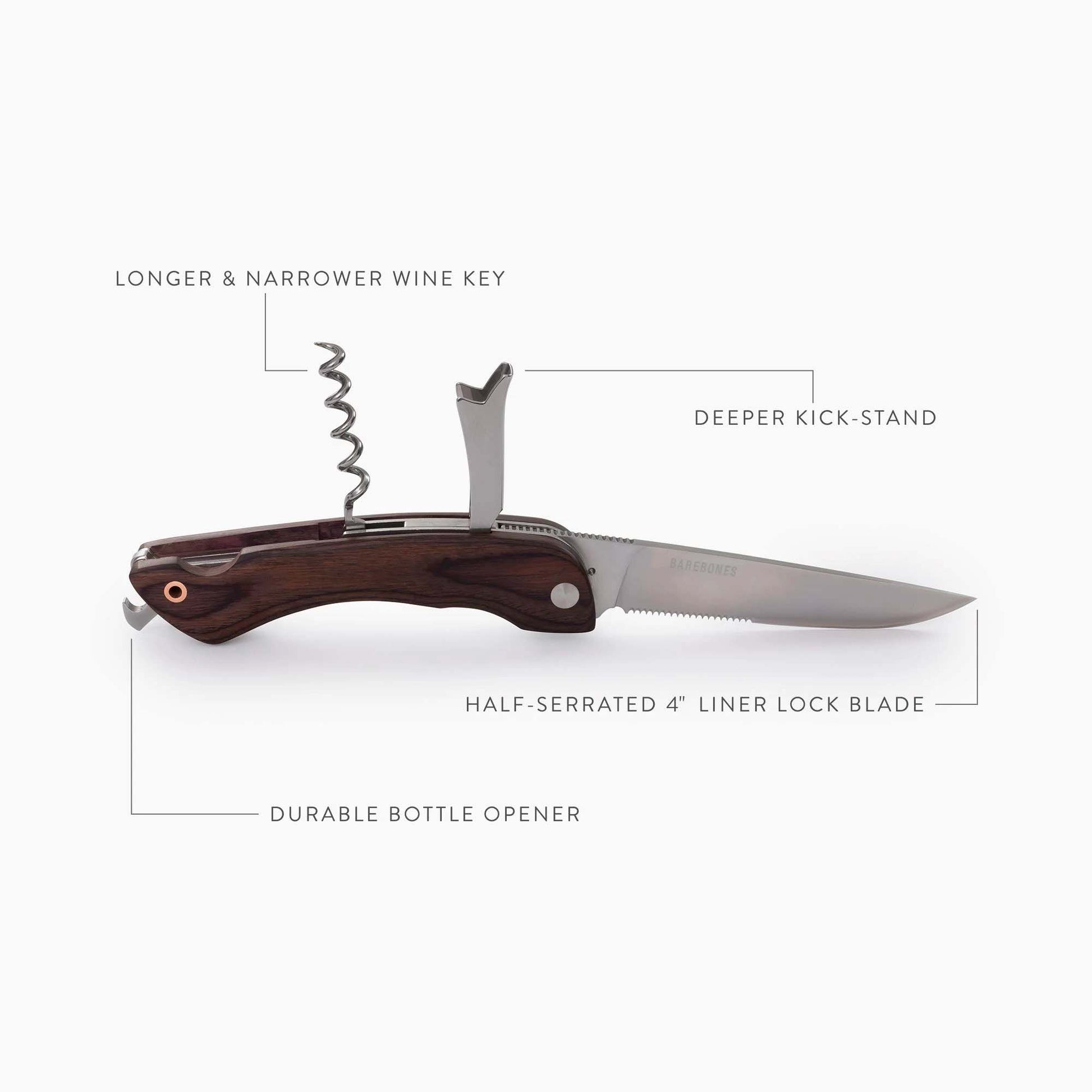 A unique combination of utility and portability, the Provisions Corkscrew Knife boasts a 4-inch half-serrated blade, wine key, and bottle opener. Slice bread, meats, and cheeses. Open a bottle of wine or beer and tuck the knife safely away for later.