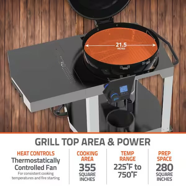 - Included: cooking grate, heat deflector, starter tray, ash cup, grill tool, temperature probe + meat probe, controller, power cord